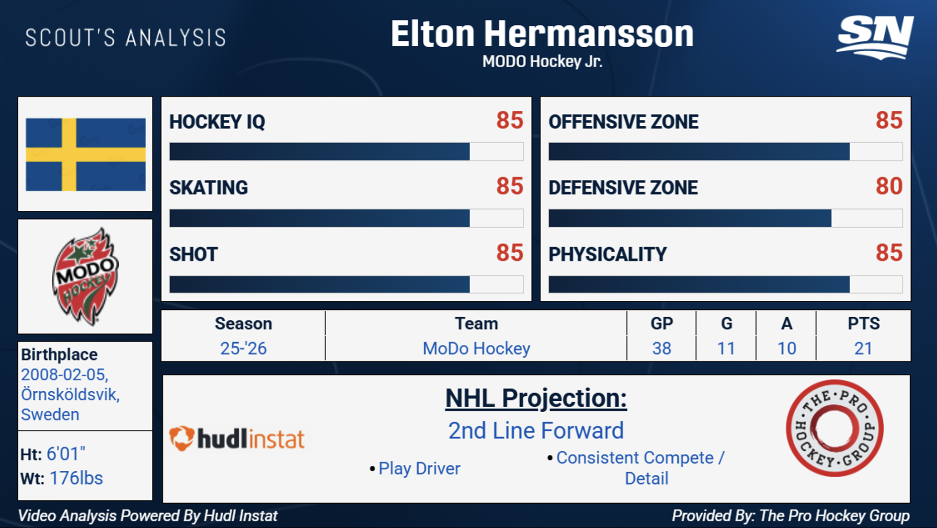Il comando è uno dei miei obiettivi draft preferiti nella seconda metà del primo spherical. Gioca un gioco serrato e dettagliato dentro e fuori dal disco e ha l’abilità e la velocità per attaccare con impeto e guidare verso la rete. Il comando ha contribuito quest’anno con 17G-27A al livello J20 in Svezia mentre è stato fischiato per 61 minuti di penalità.