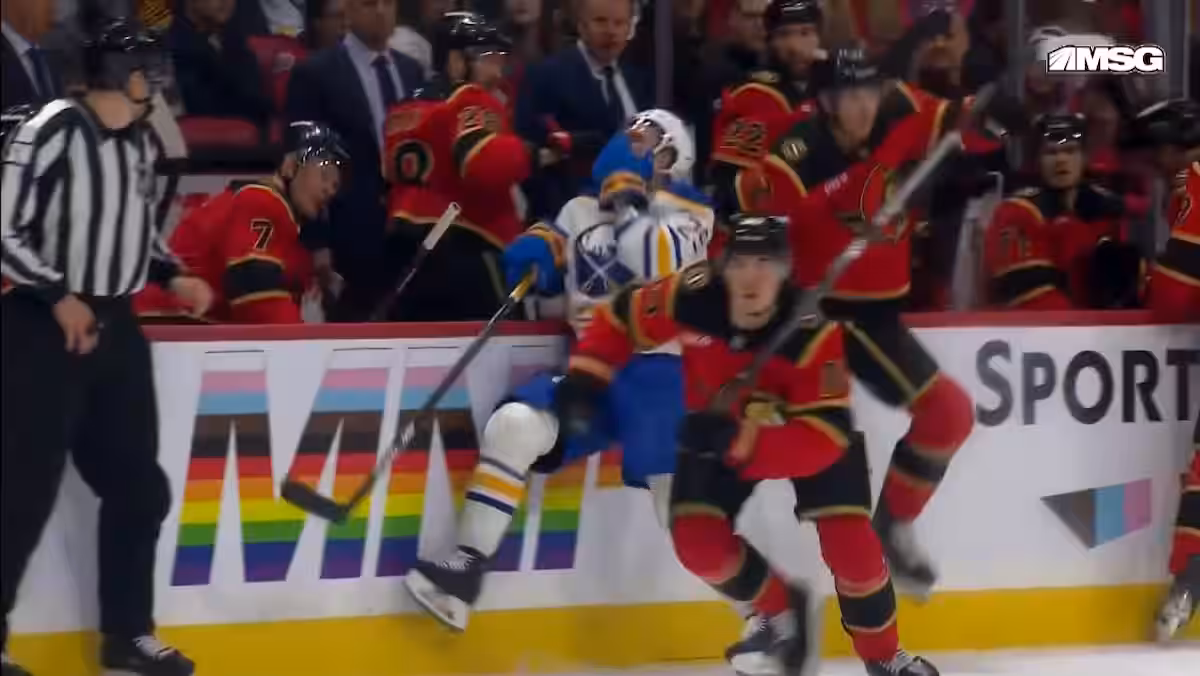 L’incidente è prodotto al mio arrivo in première période. Assis au banc des joueurs, Tkachuk a profité d’une bousculade à proximité pour doner un coup de bâton au visage du joueur des Sabres Beck Malenstyn (vedere il video principale).