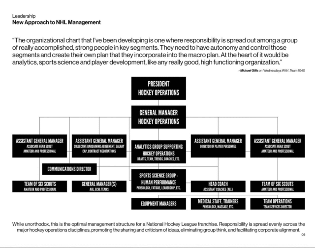 Quello di Gillis pitch deck trapelato diventare presidente dei Pittsburgh Penguins nel 2021 – un incarico che ironicamente è andato all’ultimo GM dei Leafs di Sundin, Brian Burke – embrace il seguente organigramma e sottolinea l’autonomia: