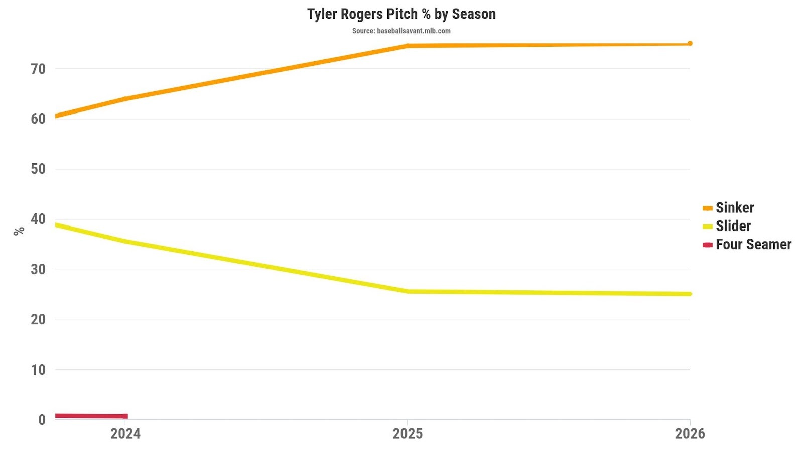 Al di là del calore stellare, Stop ha anche dimostrato una notevole variabilità nel suo approccio. La scorsa stagione, il veterano ha lanciato una palla veloce o uno slider l’82,9% delle volte, ma quel numero è sceso al 63,4% nel suo primo inizio del 2026 poiché ha utilizzato sei tiri diversi almeno sette volte. In parte questo avrebbe potuto essere uno sforzo per mantenere sbilanciata una formazione di atletica leggera composta da giovani potenti battitori, ma un aggiustamento che dovrebbe restare è un maggiore utilizzo del cambio.