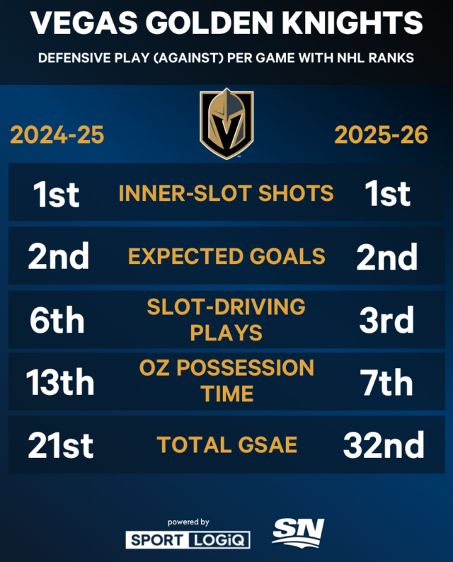 Qualsiasi diagnosi di ciò che ha afflitto i Golden Knights in questa stagione deve iniziare con i loro objective. Vegas rimane una delle migliori squadre difensive del campionato ed è persino migliorata in alcune aree, ma i suoi quattro portieri – Akira Schmid, Adin Hill, Carter Hart e Carl Lindbom – hanno totalizzato il minor numero di partenze di qualità in campionato (35) in 72 partite. In altre parole, i portieri dei Golden Knights si sono comportati meglio del previsto in meno della metà delle partite della squadra.