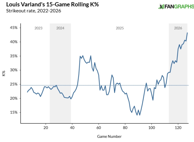 Gli impeccabili risultati di Varland nel 2026 potrebbero essere solo un piccolo esempio, ma per lui non hanno precedenti. Il destriero ha avuto tratti simili mantenendo i run fuori dal tabellone, come quando ha prodotto un’ERA pari a 0,56 in 15 partite da tremendous giugno a inizio luglio dello scorso anno, ma i suoi numeri di fondo sono molto più impressionanti ora. In particolare, sta eliminando i battitori a una velocità diversa da qualsiasi cosa sia riuscita a gestire in un arco di tempo simile.