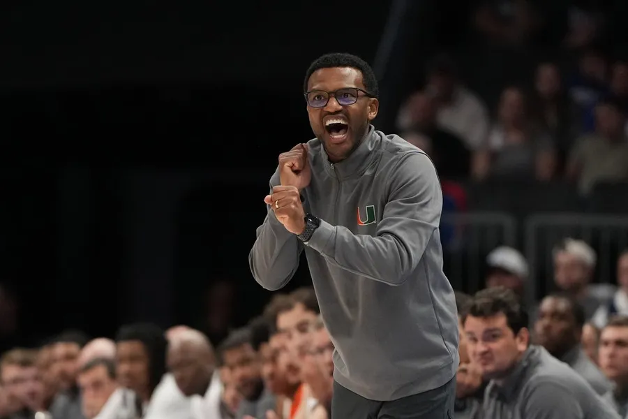 13 marzo 2026; Charlotte, Carolina del Nord, Stati Uniti; Jai Lucas, allenatore capo degli Hurricanes di Miami (FL), reagisce nella prima metà allo Spectrum Middle. Credito obbligatorio: Immagini di Bob Donnan-Imagn