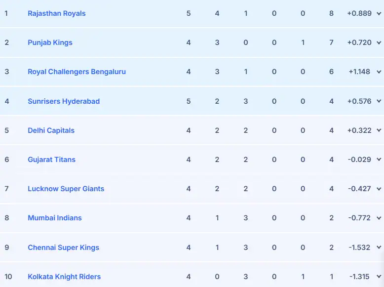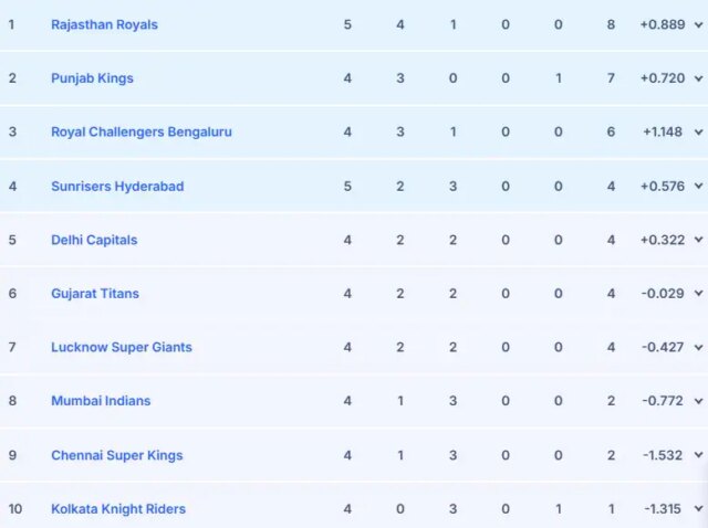 Punti IPL 2026 aggiornati dopo lo smantellamento di SRH RR