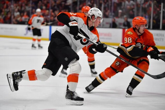 18 marzo 2026; Anaheim, California, Stati Uniti; Il centro dei Philadelphia Flyers Christian Dvorak (22) spara in porta contro il difensore degli Anaheim Geese Pavel Mintyukov (98) durante il terzo periodo all’Honda Heart. Credito obbligatorio: Immagini Gary A. Vasquez-Imagn