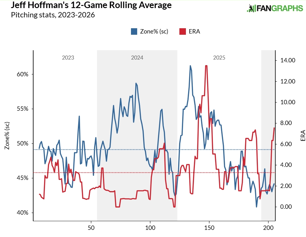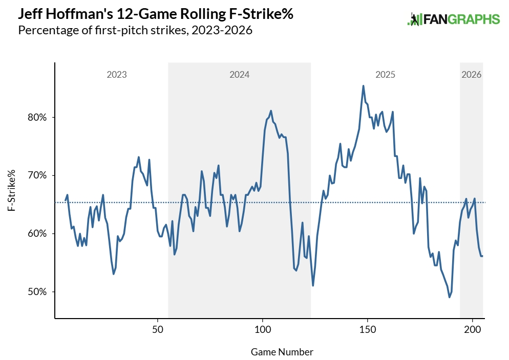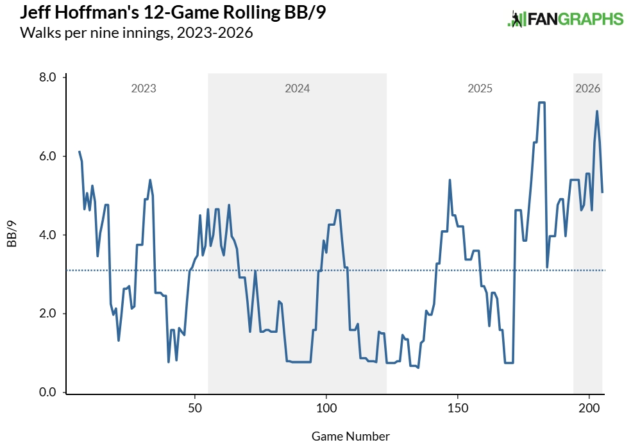 Le palle che cadono per colpire non sono l’unico problema di Hoffman. Anche il destrimano non lancia abbastanza strike. Il suo stroll fee (5,06 BB/9) è elevato per un mitigatore advert alta leva e, anche nel contesto di un campione di 12 partite, è uno dei suoi picchi più grandi degli ultimi anni.