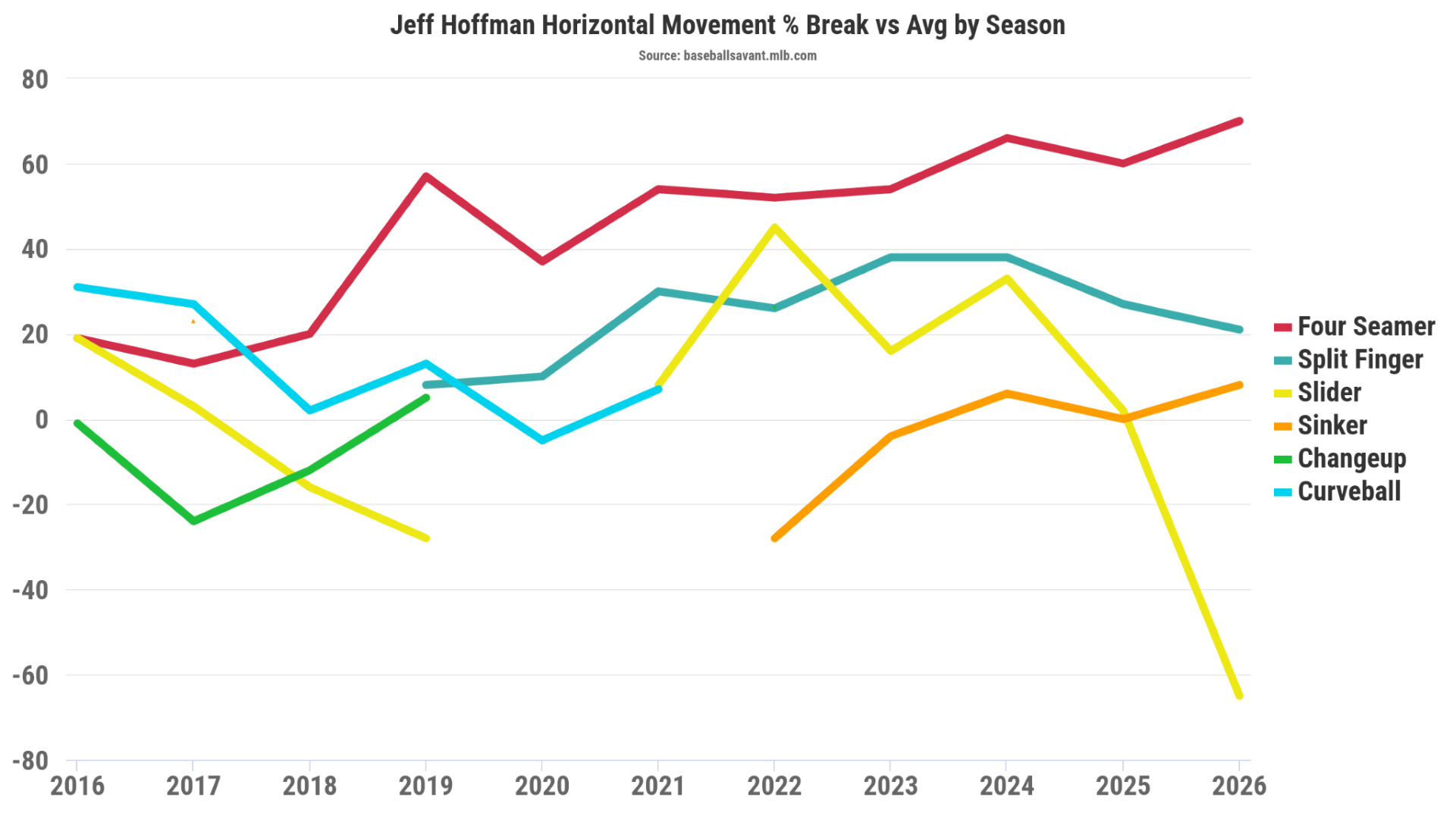 È una tendenza interessante che vale la pena monitorare, ma non spiega molto cosa è successo a Hoffman in questa stagione. Nonostante la perdita di movimento, lo slider del destriero è stato il suo miglior valore di lancio per corsa nel 2026 (più-1) con i battitori che ci sono andati contro il 63,3% delle volte.