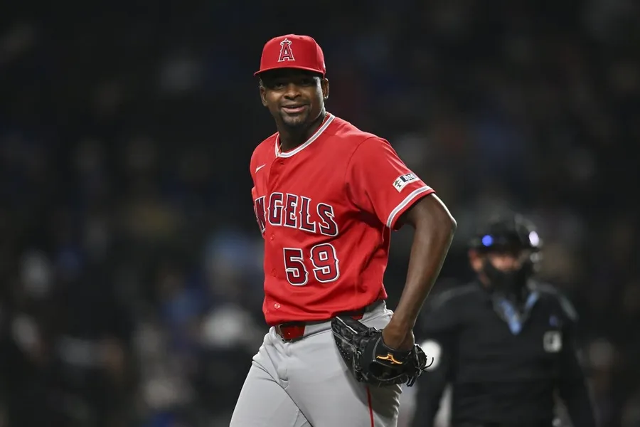 31 marzo 2026; Chicago, Illinois, Stati Uniti; Il lanciatore dei Los Angeles Angels Jose Soriano (59) sorride dopo aver terminato il quinto inning contro i Chicago Cubs al Wrigley Subject. Credito obbligatorio: Immagini Patrick Gorski-Imagn
