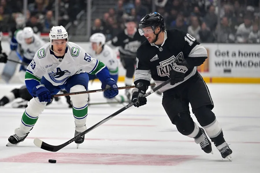 9 aprile 2026; Los Angeles, California, Stati Uniti; Il centro di Vancouver Canucks Teddy Blueger (53) insegue l’ala sinistra Artemi Panarin (10) dei Los Angeles Kings durante il secondo periodo alla Crypto.com Area. Credito obbligatorio: immagini di Jayne Kamin-Oncea-Imagn