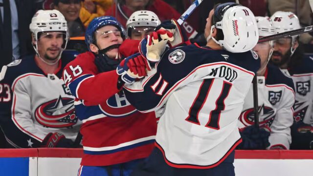 On l’a vu contre les Blue Jackets de Columbus, quand, après une mise en échec, il a tenté de repousser Miles Wooden, qui mesure 6 pi 2 po et pèse 210 lb, comparament aux 5 pi 9 et 162 lb di Hutson. Jake Evans è in missione in difesa. (Visualizza il video principale.)