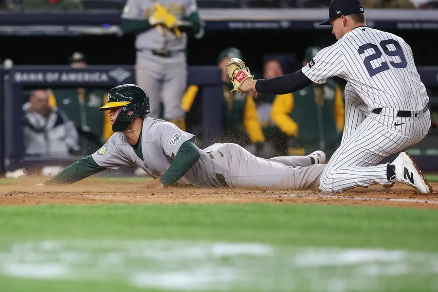 8 aprile 2026; Bronx, New York, Stati Uniti; Il terzo base dell’atletica Max Muncy (3) scivola in sicurezza oltre il tag del lanciatore iniziale dei New York Yankees Will Warren (29) nel quarto inning allo Yankee Stadium. Credito obbligatorio: Immagini Wendell Cruz-Imagn