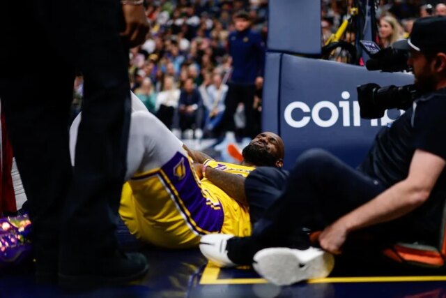 Con 4:05 da giocare nella sconfitta per 120-113 dei Lakers contro i Nuggets, James ha guidato per un layup ma è caduto forte oltre la linea di fondo.