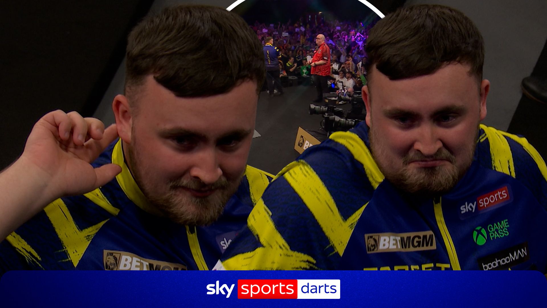 Luke Littler reagisce al pubblico di Brighton con un’alzata di spalle e indicando il suo orecchio dopo aver sentito alcuni fischi durante la sua comparsa.