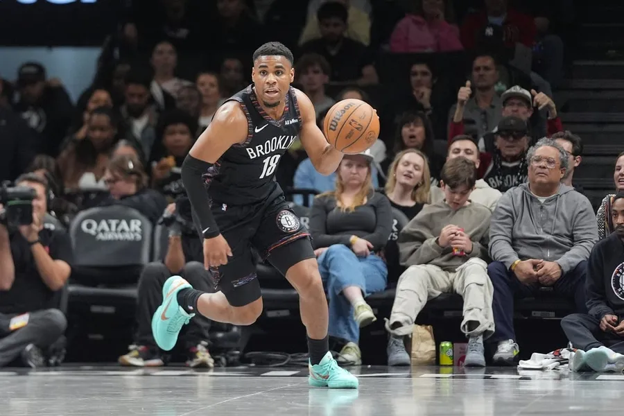3 aprile 2026; Brooklyn, New York, Stati Uniti; La guardia dei Brooklyn Nets Malachi Smith (18) dribbla la palla sul campo contro gli Atlanta Hawks durante la prima metà al Barclays Heart. Credito obbligatorio: Immagini Gregory Fisher-Imagn
