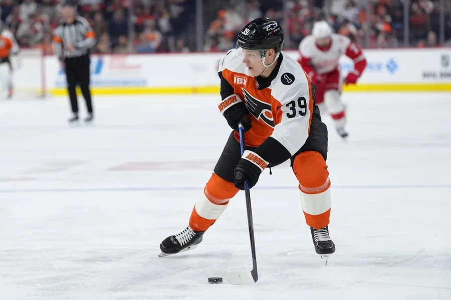 2 aprile 2026; Filadelfia, Pennsylvania, Stati Uniti; Matvei Michkov (39), ala destra dei Philadelphia Flyers, controlla il disco contro i Detroit Purple Wings nel terzo periodo alla Xfinity Cell Enviornment. Credito obbligatorio: Immagini di Kyle Ross-Imagn