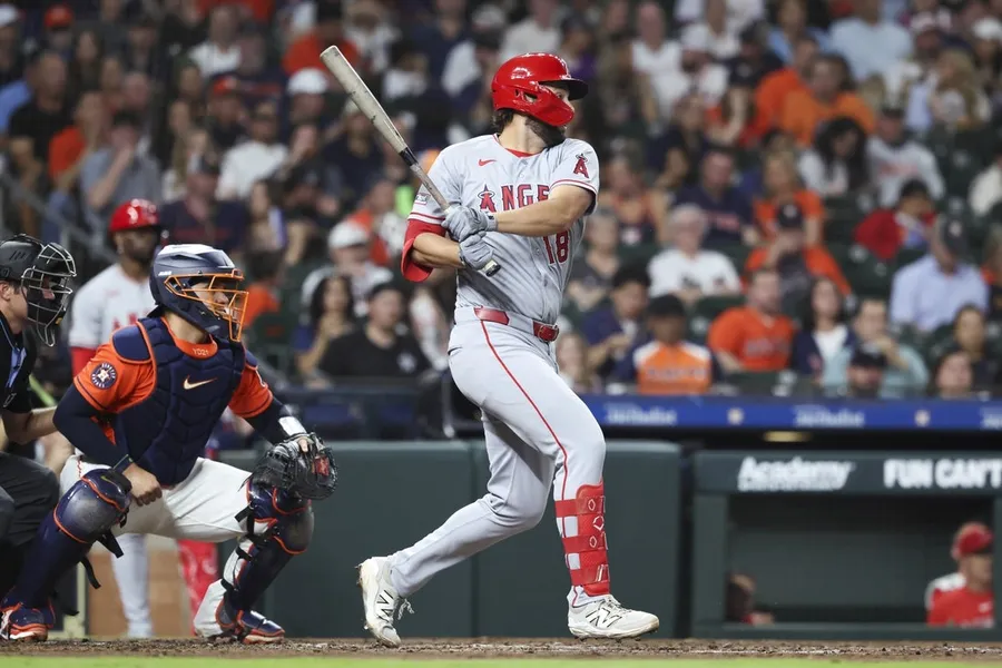 27 marzo 2026; Houston, Texas, Stati Uniti; Il primo base dei Los Angeles Angels Nolan Schanuel (18) colpisce un singolo durante il terzo inning contro gli Houston Astros al Daikin Park. Crediti obbligatori: Troy Taormina-Imagn Pictures