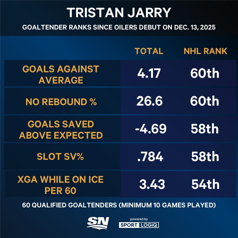 Ma da quando è atterrato a Edmonton, Jarry è regredito in modo significativo. Ha realizzato 4,7 gol sopra le aspettative e ha registrato quattro partenze di qualità in 13 tentativi (30,8%). Un portiere guadagna una partenza di qualità quando para più aim del previsto.