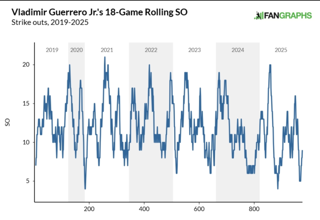 Si tratta di un mezzo decennio nel complesso impressionante, ma Guerrero è stato difficile da prevedere su base annua. Nel 2021 e nel 2024, ha vinto i premi Silver Slugger e si è classificato tra i primi sei nella votazione MVP. Nel 2022, 2023 e 2025, è stato più un ottimo titolare che una famous person, non superando mai i 30 fuoricampo o i 4 fWAR in nessuna di quelle campagne.