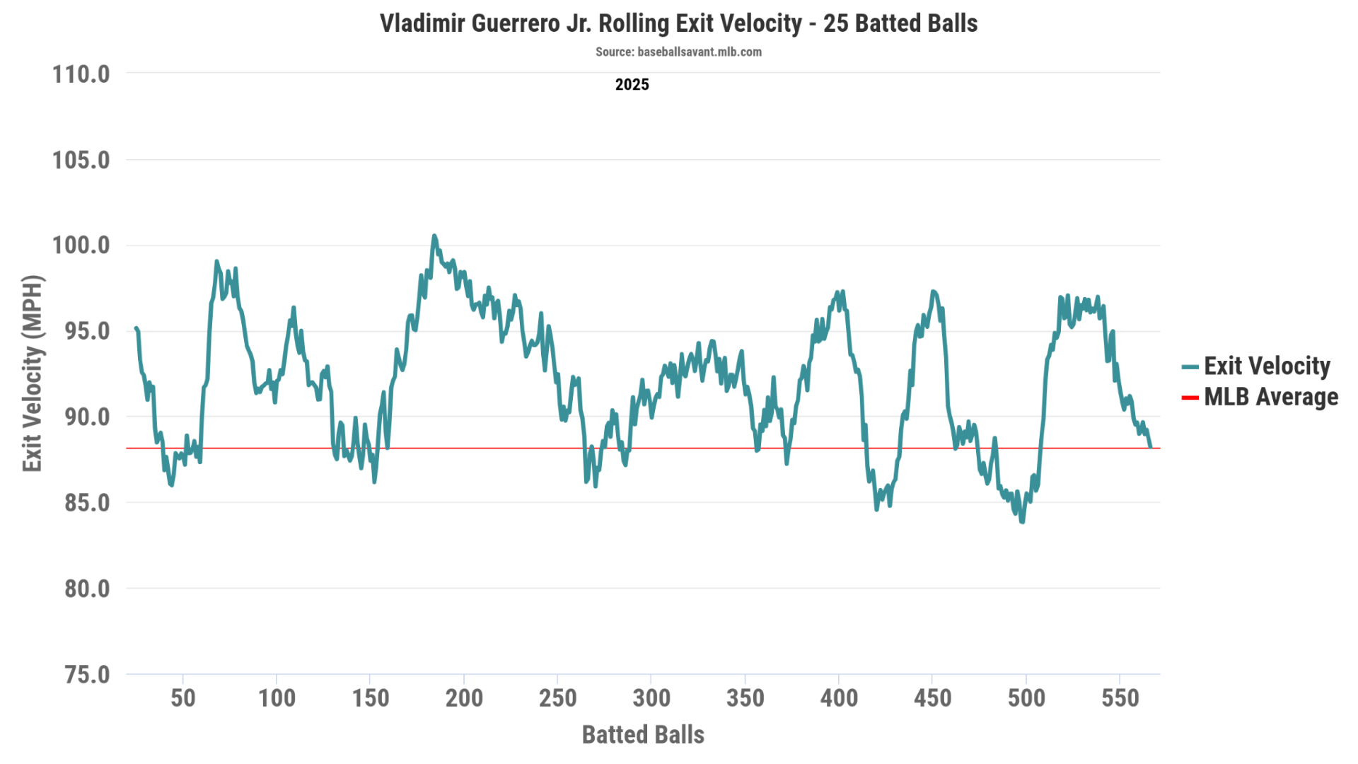 Guerrero non sta prendendo contatti solo nel periodo che precede la stagione; ha caricato la palla. Le sue 27 palle in gioco questa primavera hanno registrato una media di 98,5 miglia orarie, un numero che ha battuto in soli due allungamenti da 25 palle battute la scorsa stagione.