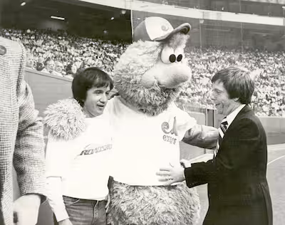 Rodger ha compiuto il passo con gli Expos au fil des ans. Mais son plus célèbre accomplissement aura sans contredit été Youppi!, la fameuse mascotte orange, qu’il aura contribué à faire naître avec Roger D. Landry. Sur cette photograph, on aperçoit la mascotte inspirée par le rouquin Rusty Staub, première grande vedette des Expos, avec son idéateur et le pianiste André Gagnon.