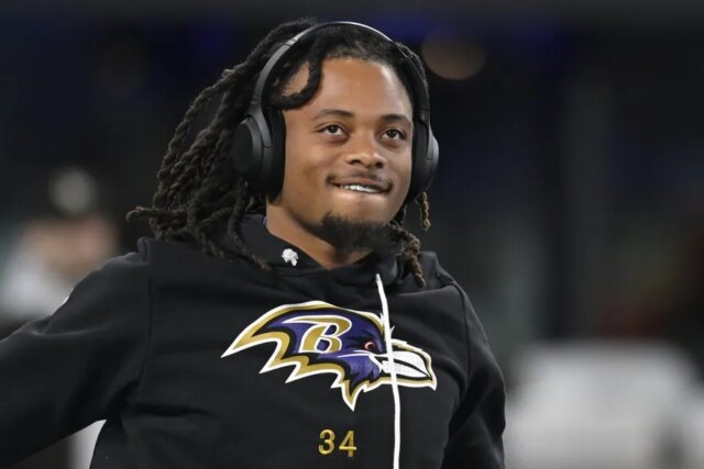 27 novembre 2025; Baltimora, Maryland, Stati Uniti; Baltimore Ravens operating again Keaton Mitchell (34) prima della partita al M&T Financial institution Stadium. Credito obbligatorio: Immagini Tommy Gilligan-Imagn