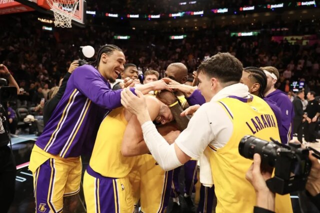 19 marzo 2026; Miami, Florida, Stati Uniti; La squadra dei Los Angeles Lakers celebra Luka Doncic (77) dopo una partita da 60 punti contro i Miami Warmth al Kaseya Middle. Credito obbligatorio: Immagini Isabella Frias-Imagn