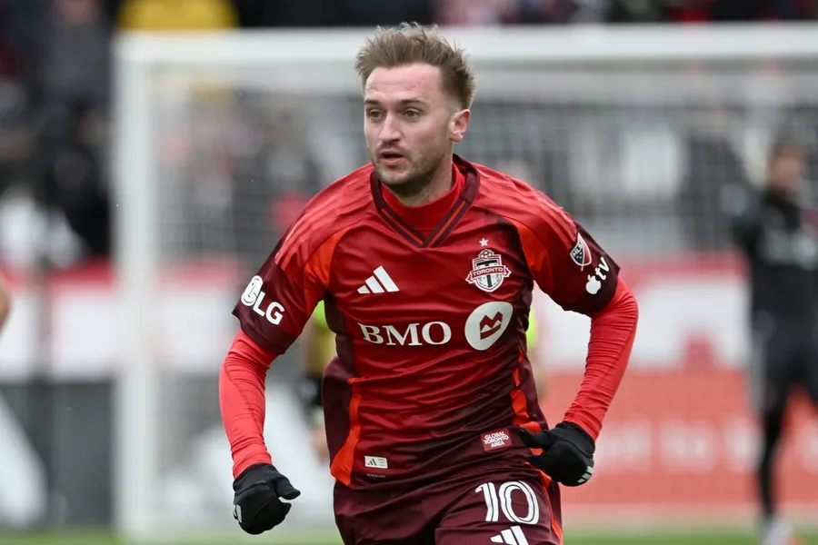 14 marzo 2026; Toronto, Ontario, CAN; Il centrocampista del Toronto FC Djordje Mihailovic (10) prosegue il gioco contro i New York Pink Bulls nella seconda metà al BMO Area. Credito obbligatorio: Dan Hamilton-Imagn Photographs