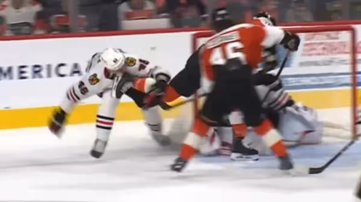 Durante la partita contro i Flyers di Filadelfia, il difensore dei Blackhawks di Chicago ha giocato di malocchio vicino al filetto della sua squadra. Ha été atteint à la bouche par le patin de l’arrière Nick Seeler.