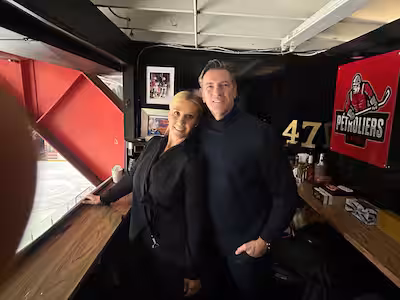 L’ancien joueur du Canadien de Montréal Patrice Brisebois aux côtés de sa femme Nadia Saputo lors du match between «Lewis le fou» et Olivier Primeau au Colisée de Laval, samedi après-midi.
