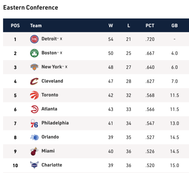 Al di là dei primi sette, sembra diventare una lotta più debole con Orlando Magic, Miami Warmth e Charlotte Hornets. I Magic sono andati a .500 fino a marzo, e gli Warmth sono a 8-7, mentre gli Hornets hanno avuto un buon periodo a 9-5.