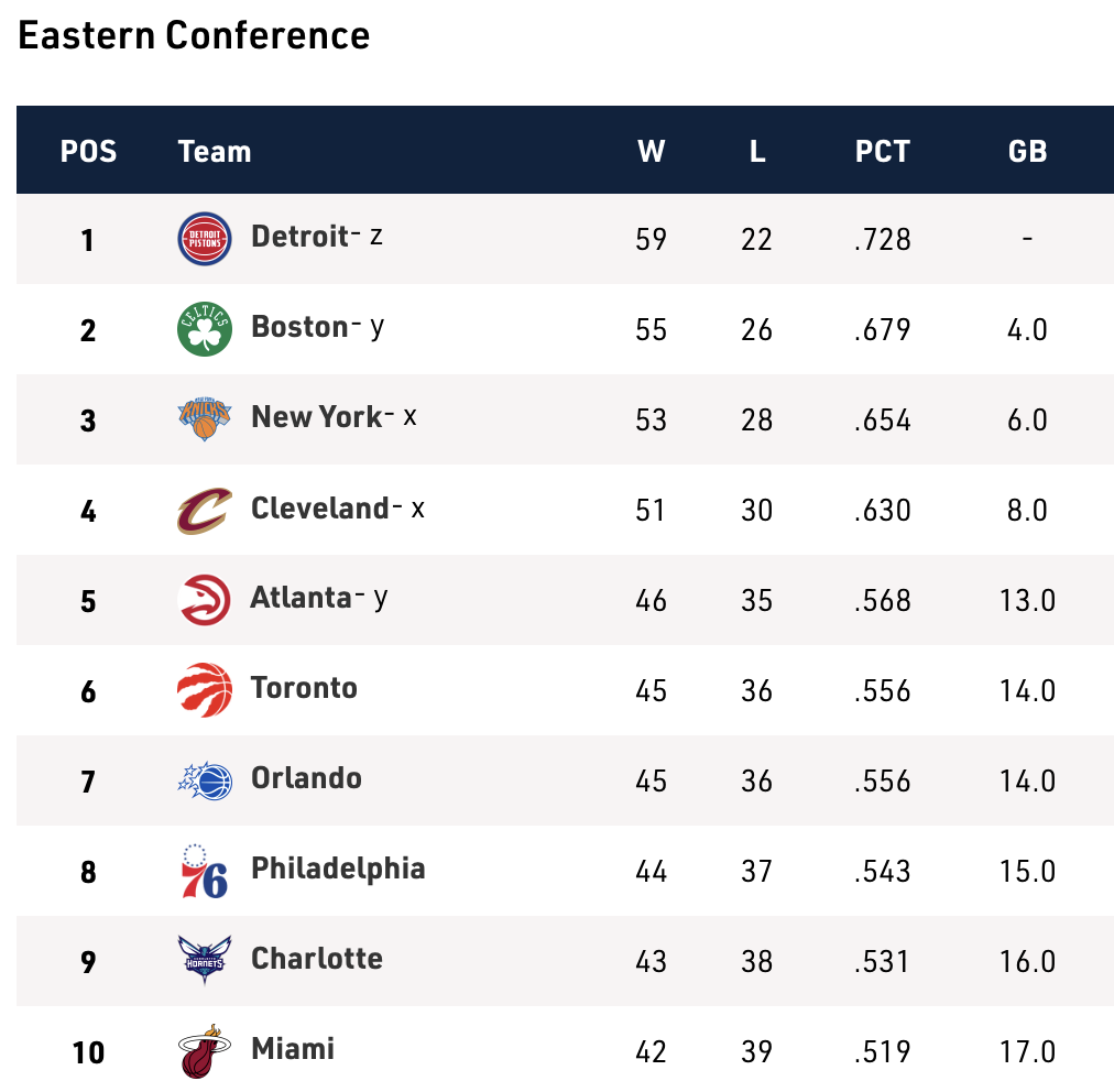 Tutti e tre, Toronto, Orlando e Filadelfia, stanno ballando sul filo del rasoio tra i playoff e i play-in in vista del finale di stagione regolare di domenica. E oltre all’ovvia ragione di voler evitare l’incertezza e la volatilità che derivano da una serie di minitornei di una o due partite, vale la pena evitare il Play-In per il fatto che coloro che escono come settima e ottava testa di serie vengono “premiati” con incontri contro due delle squadre più calde del campionato, i Pistons e i Boston Celtics.