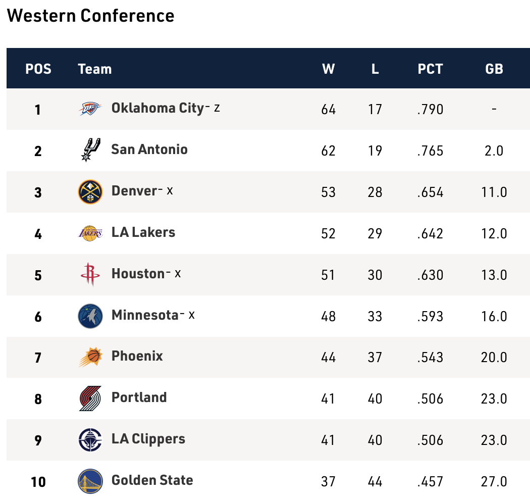 I Nuggets possono conquistare il terzo posto domenica con una vittoria sugli Spurs OPPURE una sconfitta dei Lakers contro i Jazz. Per quanto riguarda LA, ci vorrà una vittoria contro lo Utah E una sconfitta a Denver per risalire dal quarto posto.