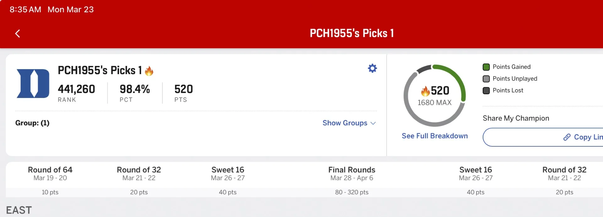 Dopo i primi due spherical, sono in cima sia al girone dei miei amici con sessanta iscritti, sia al girone della mia famiglia con sei. Considerando un campione più ampio, le mie parentesi si collocano nel 98° percentile tra i 27 milioni di parentesi partecipanti alla sfida ESPN.