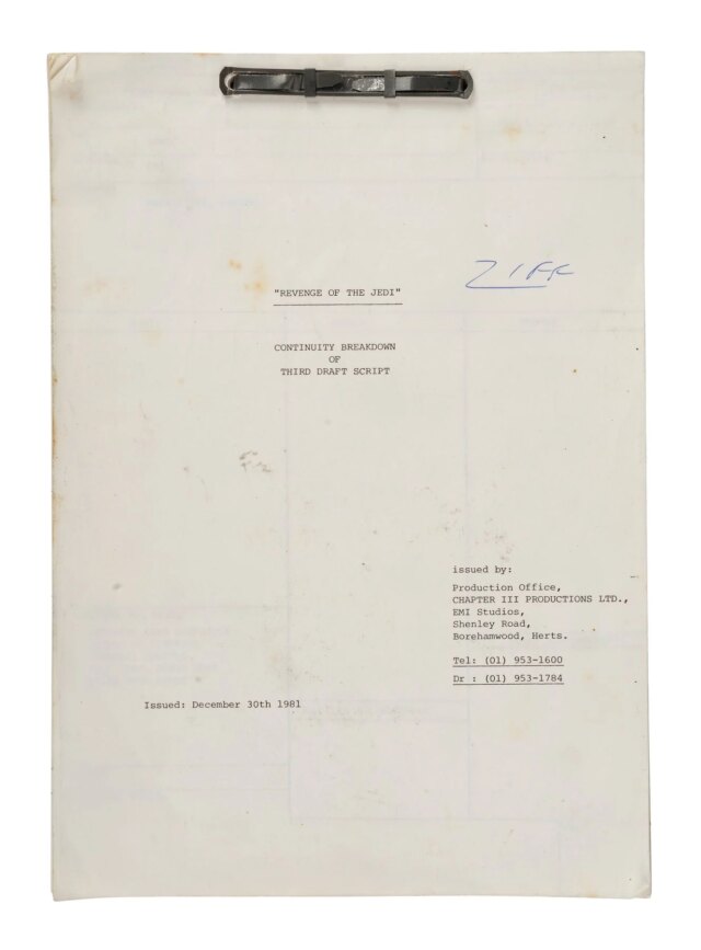 Infine, puoi anche fare un’offerta su Ziff’s La vendetta degli Jedi (notare il titolo originale lì) rottura della continuità rilegata con le sue annotazioni scritte a mano, stimata in vendita tra $ 1.500 e $ 3.000.