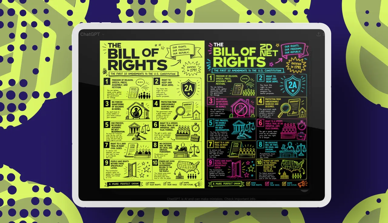 Ecco il primo suggerimento: “Fammi uno schizzo della Carta dei diritti degli Stati Uniti. Usa lo stile del emblem ZDNET e crea gli schizzi nello stile ZDNET.” Questa è l’immagine a sinistra. Ecco il secondo suggerimento: “Includi il emblem ZDNET e aggiungi più colori in stile neon, magari su uno sfondo nero”. Questa è l’immagine a destra.
