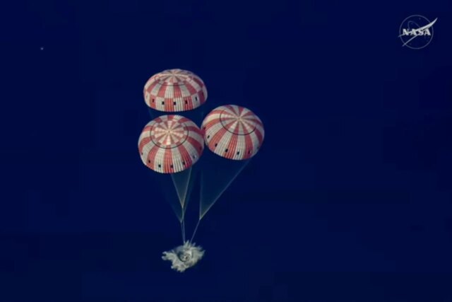 Advert un’altitudine di 22.000 piedi (6.706 metri), i paracadute frenanti si sono aperti, rallentando e stabilizzando la capsula. I paracadute furono quindi rilasciati a 6.000 piedi (1.829 metri) e i tre paracadute principali furono schierati. Ciò ha rallentato l’Integrity a meno di 136 miglia all’ora (219 chilometri all’ora). Nel punto di ingresso nell’atmosfera, la capsula stava cadendo a una velocità di circa 38.405 km/h, oltre 30 volte più veloce della velocità del suono.