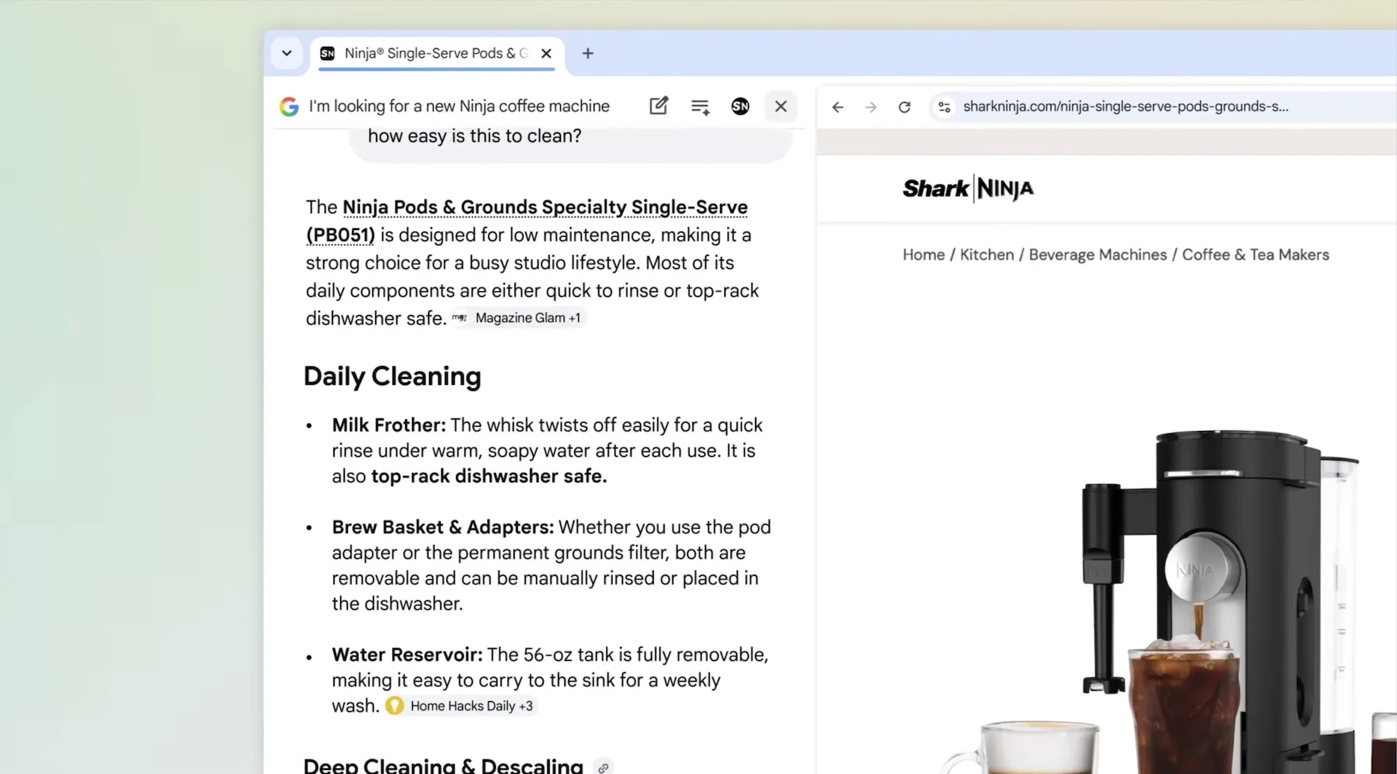 Google ha fornito un esempio di acquisto per illustrare questa funzionalità. Supponiamo che tu stia acquistando una caffettiera compatta in grado di preparare un latte decente. Descrivi ciò che desideri in modalità AI e lo cerchi. Trovi un modello che ti piace e fai clic sul suo collegamento. Invece di aprirsi in una nuova scheda, si aprirà proprio lì, sul lato destro.