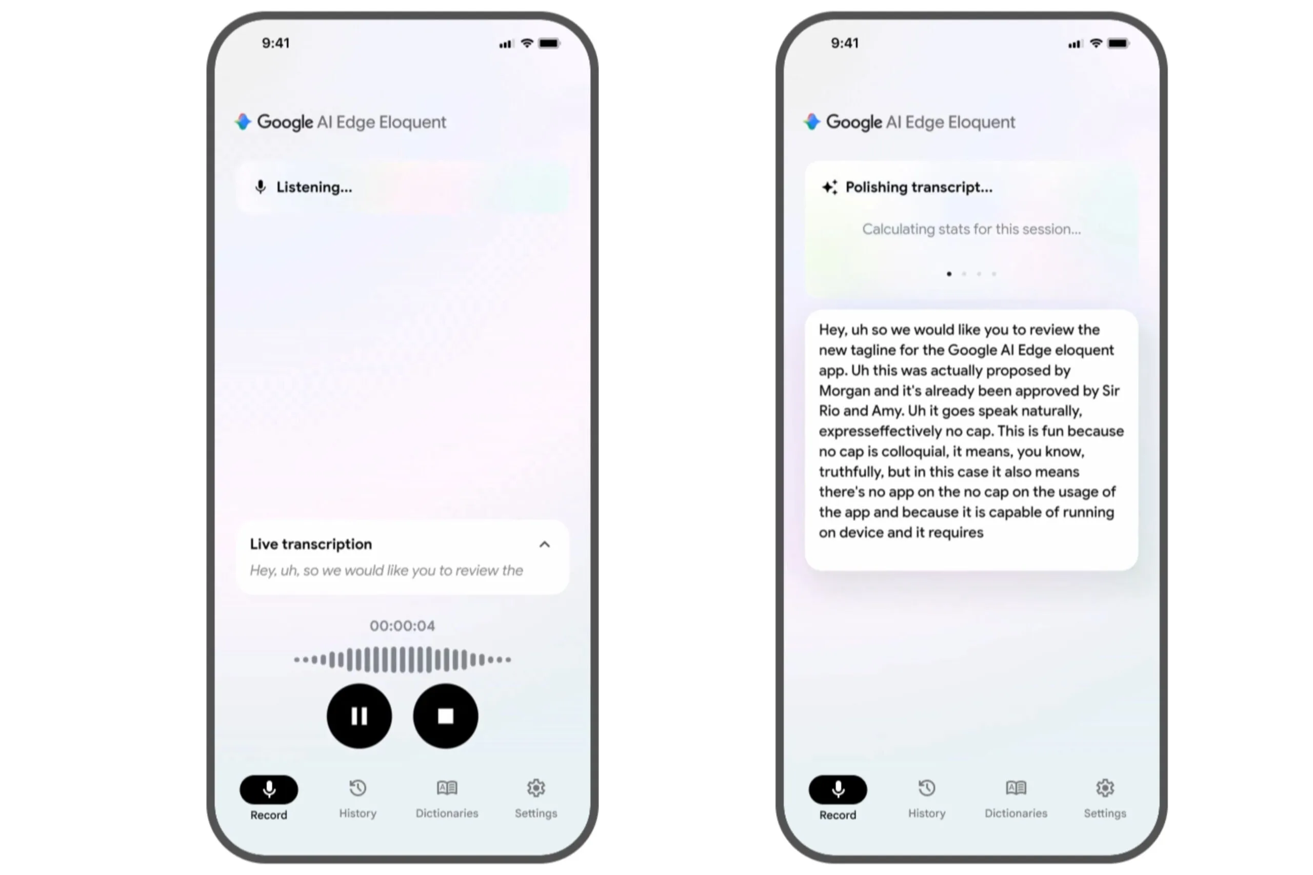 Google ha appena lanciato una nuova app iOS oggi senza alcun annuncio ufficiale. L’app, individuata per la prima volta da 9to5Googleviene chiamato Google AI Edge Eloquente. È uno strumento di dettatura vocale offline che trascrive il tuo discorso in tempo reale, rimuove automaticamente le parole di riempimento e fornisce testo pulito e raffinato. Google Eloquent è completamente gratuito senza alcun abbonamento o limite di utilizzo.