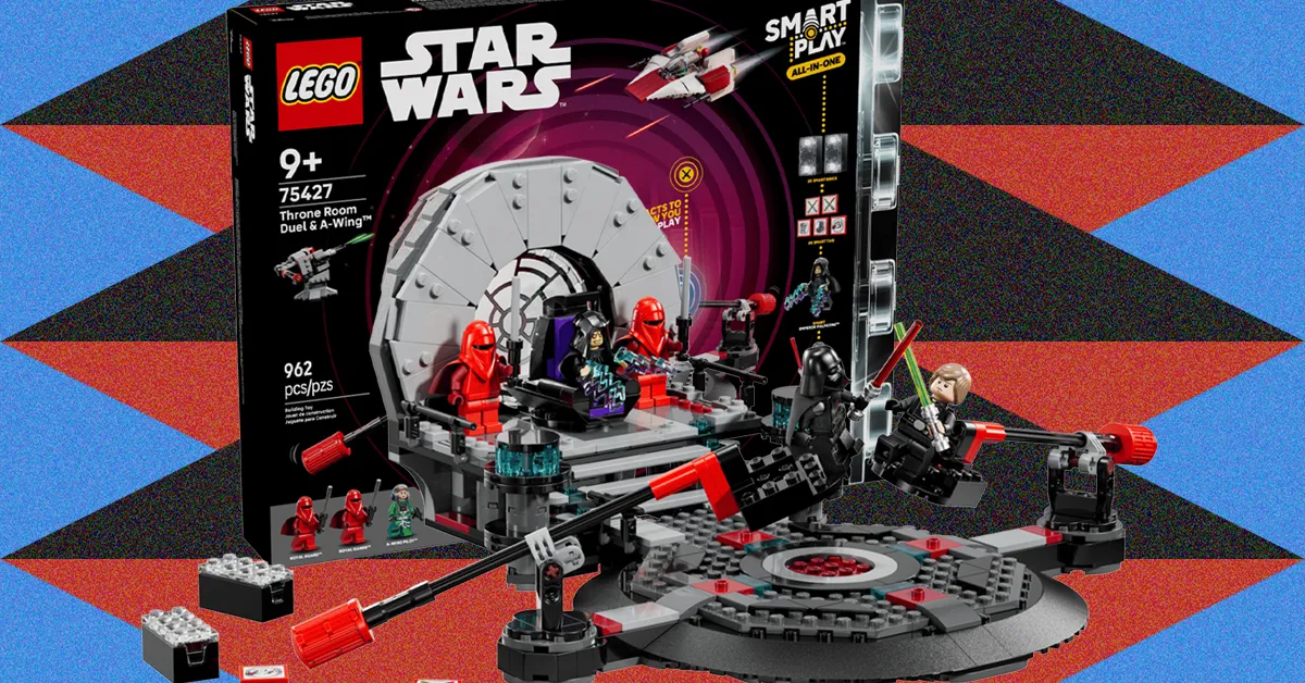 Il Lego Star Wars Throne Room Duel e A-Wing è uno dei nuovi set Sensible Play di Lego con Sensible Bricks che aggiungono luce e suono. Questo set da 962 pezzi embrace due Sensible Brick, tre Sensible Minifigure, cinque Sensible Tag e un caricabatterie Sensible. Ti consente di ricreare la battaglia finale con la spada laser Star Wars: Il ritorno dello Jedi mentre l’Imperatore Palpatine siede sul suo trono, guardando Darth Vader e Luke Skywalker combattere. È una costruzione semplice che embrace anche un’A-Wing e una torretta con un cannone, in omaggio alla battaglia spaziale che infuria intorno alla Morte Nera.