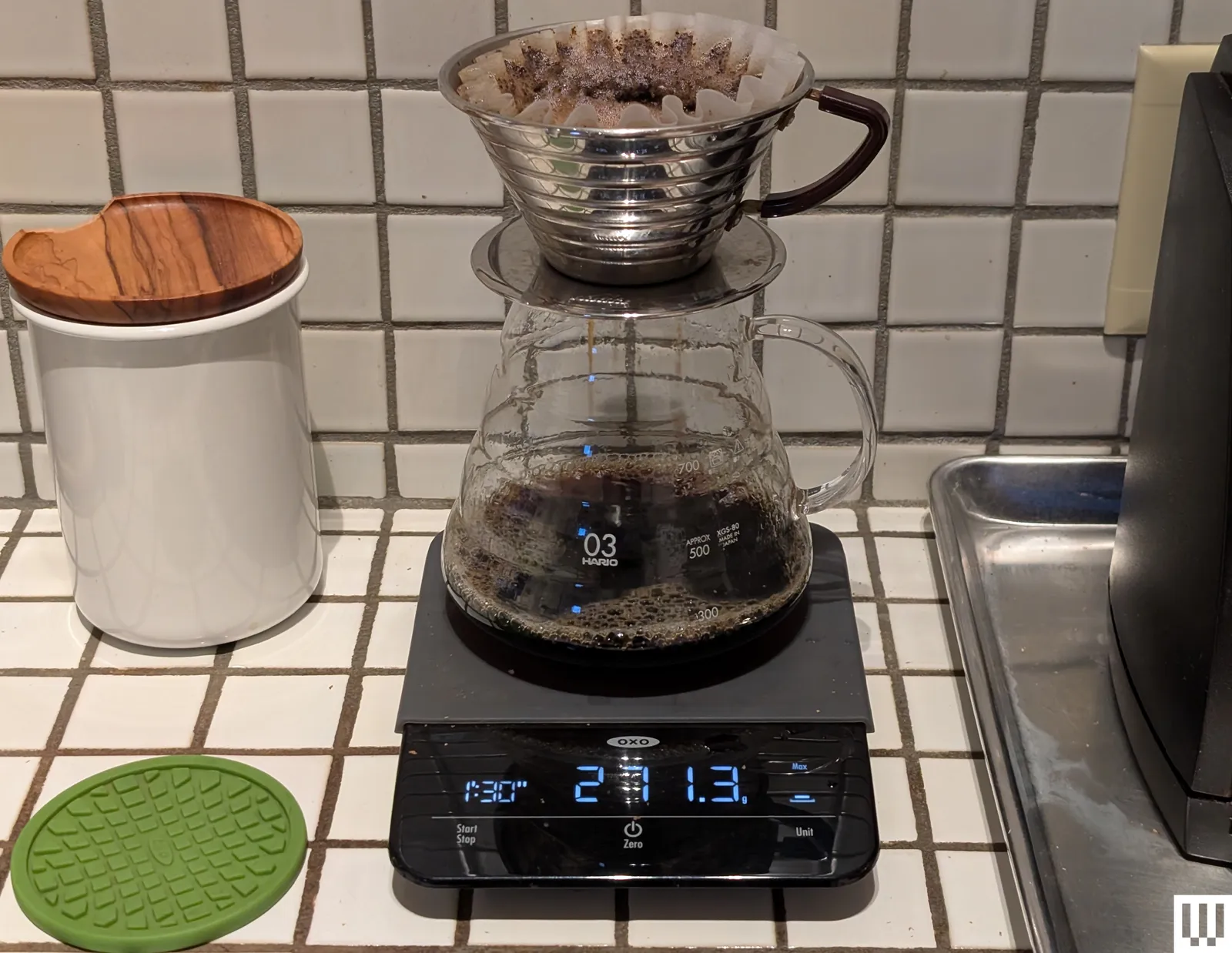 Il trucco sta nel design. Il fondo piatto consente alla maggior parte del caffè di saturarsi completamente distribuendo l’acqua in modo più uniforme tra i fondi. Puoi saturare adeguatamente il tuo caffè in un V60 se lo versi con attenzione, ma con un Kalita Wave, poiché una maggiore quantità di fondi viene raccolta sul fondo piatto del filtro, è più facile bagnarli uniformemente. I tre piccoli fori controllano il flusso, restringendolo quel tanto che basta per far sì che il caffè venga estratto opportunamente prima che fuoriesca.