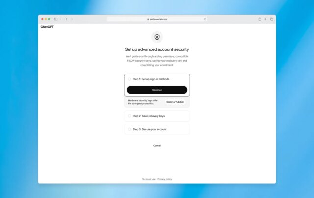 Le persone che abilitano la sicurezza avanzata dell’account non possono più utilizzare le password normali sui propri account. Devono invece aggiungere due chiavi di sicurezza fisiche o passkey per ridurre significativamente il rischio di attacchi di phishing riusciti. La funzionalità elimina anche messaggi di posta elettronica e SMS e percorsi per il ripristino dell’account. Gli utenti devono invece utilizzare chiavi di ripristino, passkey di backup o chiavi di sicurezza fisiche. OpenAI afferma di aver collaborato con Yubico per offrire pacchetti YubiKey a basso costo agli utenti di Superior Account Safety.