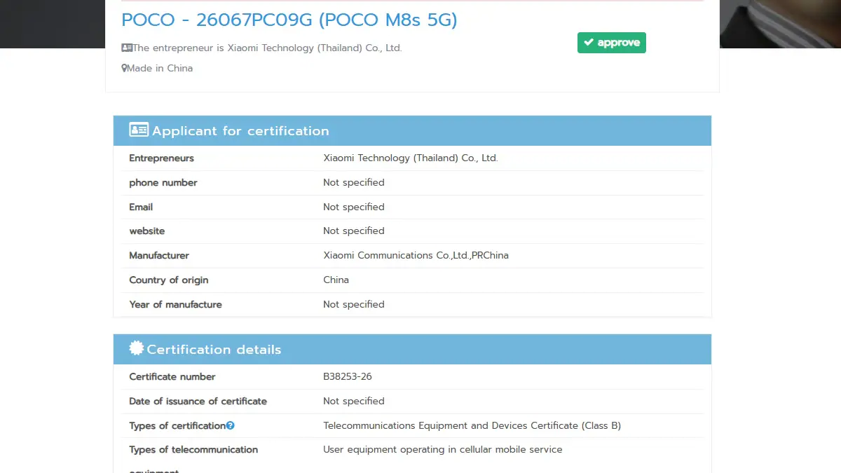 Il Poco M8s non annunciato è elencato sul sito internet della Nationwide Broadcasting and Telecommunication Fee (NBTC) con il numero di modello Poco 26067PC09G. L’elenco mostra che lo smartphone supporta le reti GSM, WCDMA, LTE e NR, indicando la connettività 4G e 5G.