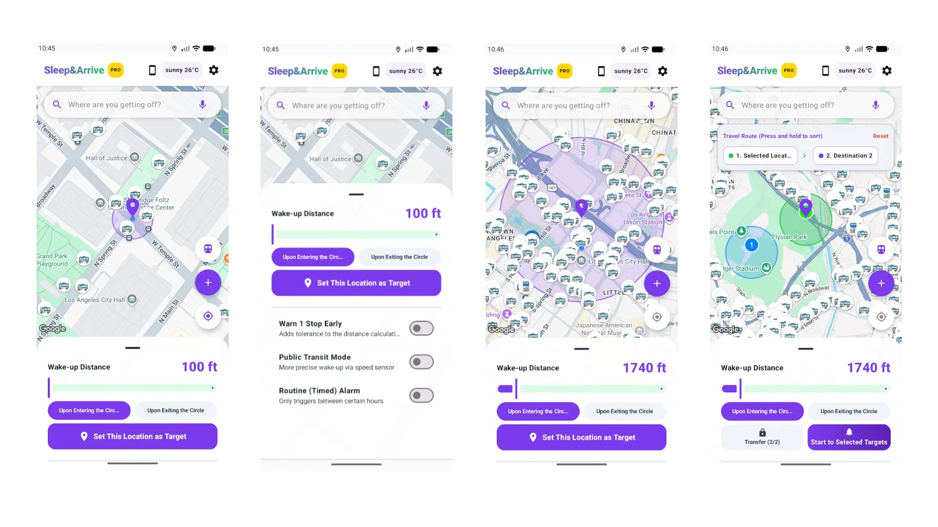 L’appello principale qui è il controllo. Sleep&Arrive ti consente di impostare un raggio di sveglia attorno alla tua fermata, il che significa che puoi scegliere un avviso più ravvicinato per un breve viaggio in autobus o più respiro per un viaggio in treno più lungo.