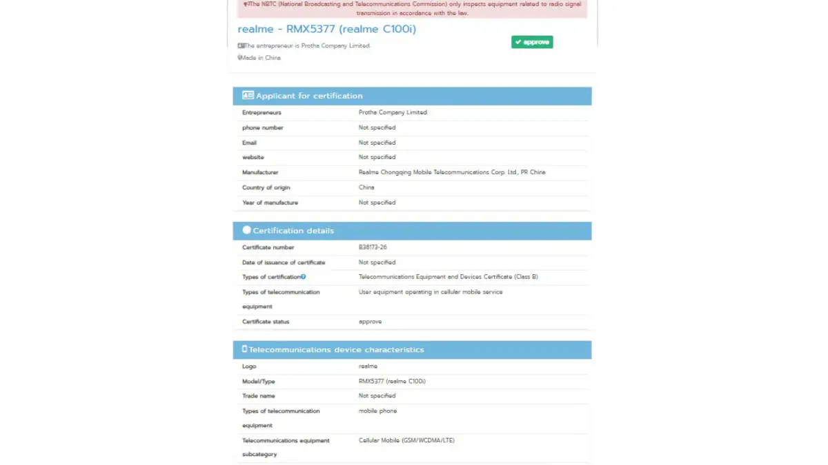 L’NBTC elenco mostra Realme C100i con il numero di modello RMX5377. Si conferma che supporterà la connettività 4G LTE, suggerendo che non includerà il supporto 5G. Nella certificazione non sono state rivelate specifiche {hardware}, ma si lascia intendere un lancio imminente. Il telefono è stato anche elencato sul TKDN indonesiano e sull’EEC europeo, ma nessuno dei due ha confermato il suo nome.
