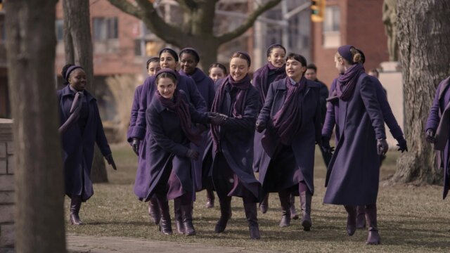 I Testamenti introduce gli spettatori a un nuovo livello della rigida gerarchia di Gilead: i Plums. Prendendo il nome dalla distinta tonalità di viola che indossano, le Prugne sono le giovani figlie di comandanti di alto rango. A differenza dei protagonisti di Il racconto dell’ancellanon avevano vite indipendenti prima di Gilead. Non sanno cosa hanno perso, sanno solo il mondo in cui sono cresciuti.