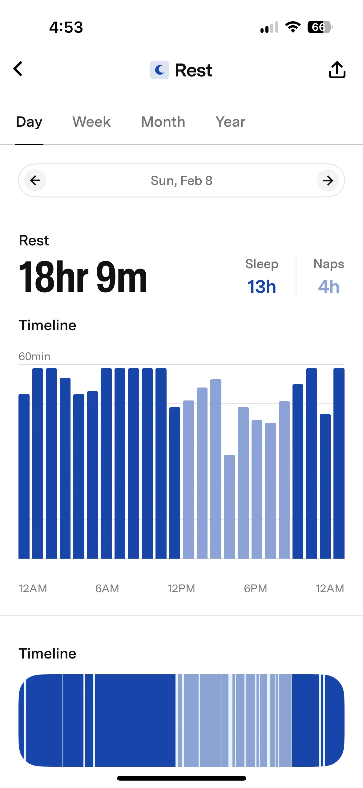 Nella scheda Riposo puoi visualizzare le metriche del sonno, incluso un riepilogo giornaliero del sonno profondo, dei sonnellini e delle interruzioni durante il sonno notturno. Puoi confrontarlo nel tempo e l’app rileva quanto Basil ha dormito in più o in meno rispetto alla notte prima. Inoltre, confronta le statistiche storicamente, per settimana, mese e anno, in modo da poter monitorare le tendenze e comprendere meglio il normale programma di sonno del tuo animale domestico.