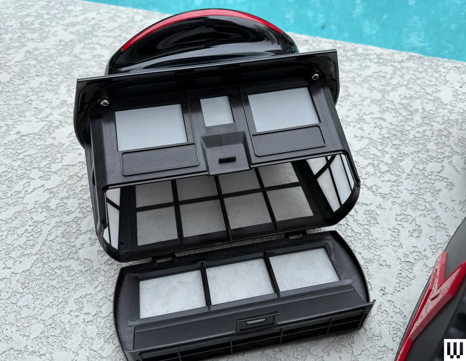 Ero meno affascinato dal processo di pulizia una volta completate le operazioni, e non solo perché il robotic deve essere recuperato con un palo invece di tornare in superficie una volta terminato. Il cestello del filtro è molto grande, ma è possibile accedervi solo attraverso uno sportello relativamente piccolo. È difficile far uscire tutti i detriti attraverso questo portello con un getto d’acqua, soprattutto perché la forma del cestino embody una sorta di ripiano all’interno, dove i detriti sono difficili da raggiungere e difficili da vedere. Un design del cestello più aperto o un portello più grande sarebbero di grande aiuto al momento della pulizia.
