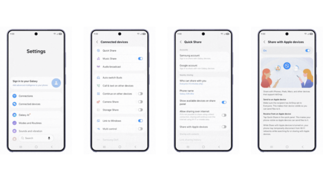 Per inviare file a un dispositivo iOS tramite Fast Share, gli utenti Samsung Galaxy S26 dovranno prima attivare “Condividi con dispositivi Apple”, che si trova nelle impostazioni del telefono in “Dispositivi connessi” e “Condivisione rapida”.