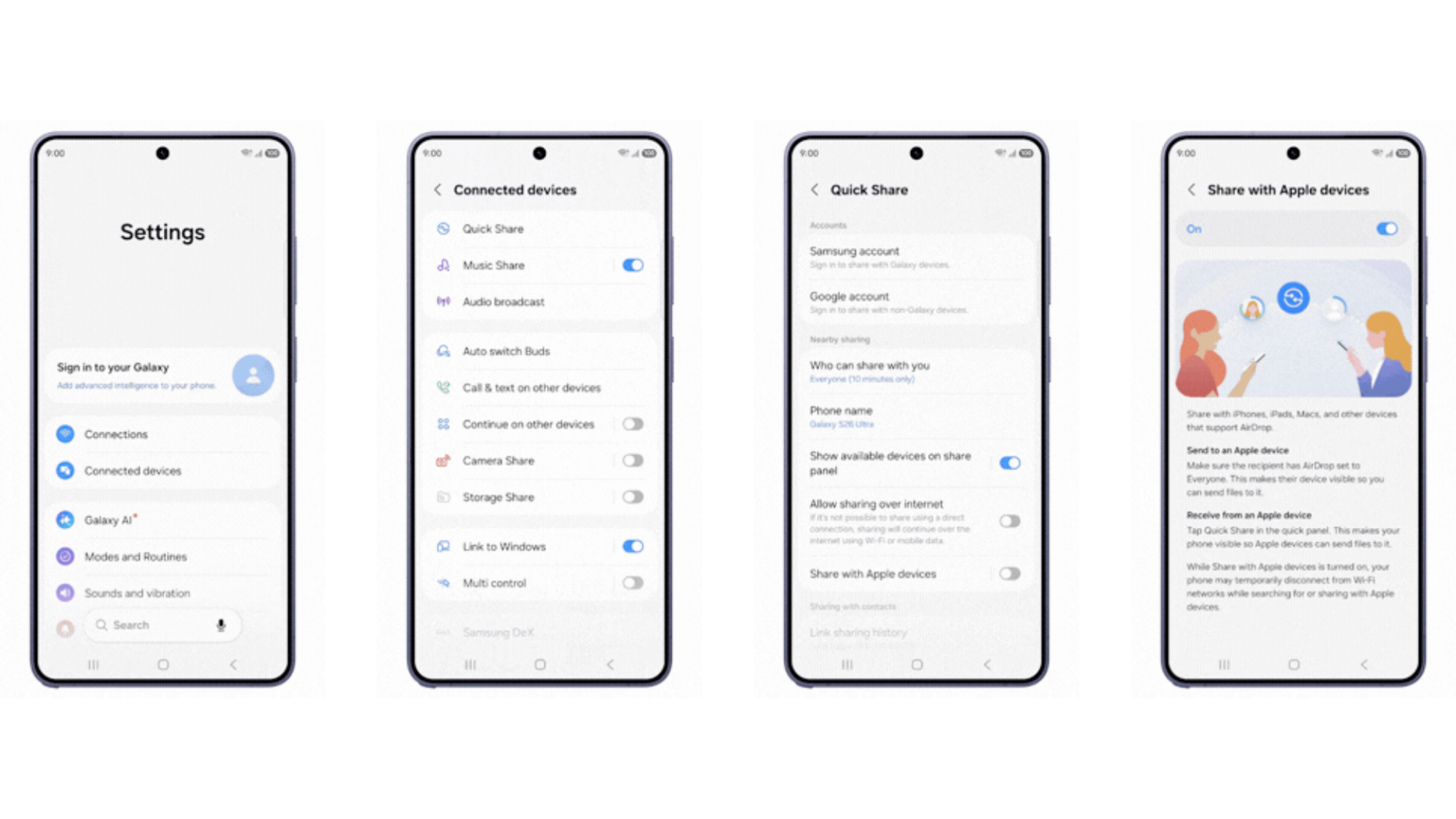Samsung sta aggiungendo il supporto AirDrop ai suoi telefoni Galaxy S26, rendendo la sua funzione di trasferimento file Fast Share compatibile con gli iPhone.